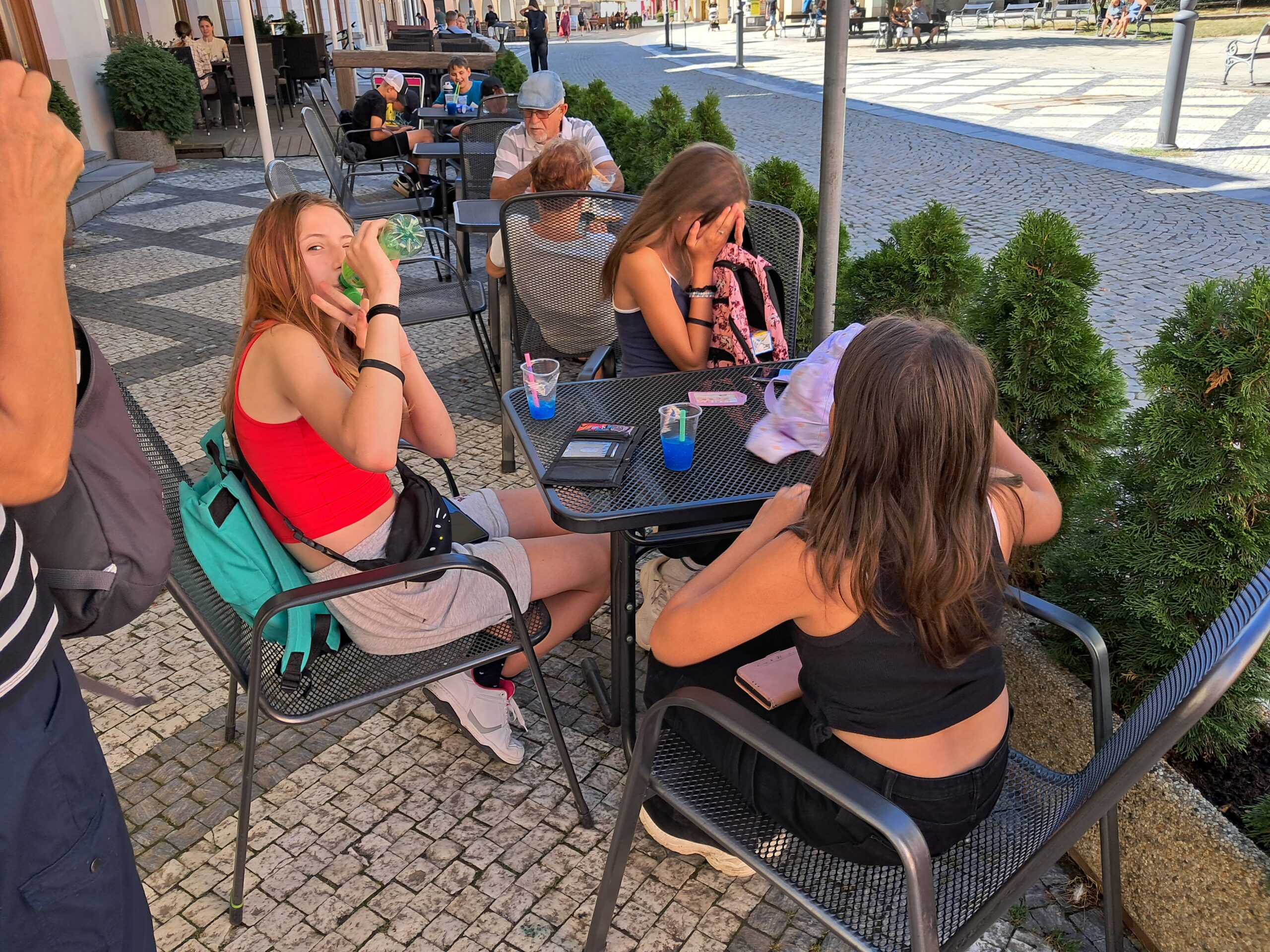 V ten den bylo horko. Někteří zvolili špatnou obuv i oděv, tak se není čemu divit, že chtěli rychle do města zlepšit si náladu, utratit, co se dá…. Po všech možných peripetiích – vyměňování bot, zalepování pat i prstů, dělení se o vodu, brblání, že příště už nikam nejedou – jsme dorazili do centra. Nálada se zlepšila a nabyla rovnováhy nejen nákupem rybiček do třídy, ale také utrácením za všechno možné 😀 Ačkoliv se to nezdá v ten den jsme našlapali cca 10 km.